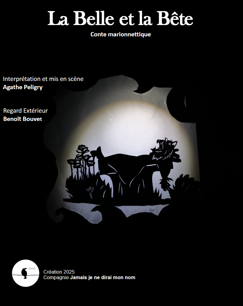 Inspiré et adapté du texte de Jeanne Marie Leprince de Beaumont, La Belle et la Bête se déploie sous la forme d’un conte marionnettique mêlant théâtre, marionnettes et ombres chinoises. Le spectacle propose une redécouverte de ce classique de la littérature à travers une forme visuelle, poétique et accessible. À travers cette relecture, la Compagnie Jamais je ne dirai mon nom met en lumière des thématiques universelles et intemporelles : l’apparence et l’altérité, la peur de l’inconnu, la transformation et la puissance du regard aimant. Le spectacle propose un voyage doux et hors du temps, où l’émotion et l’imaginaire occupent une place centrale.